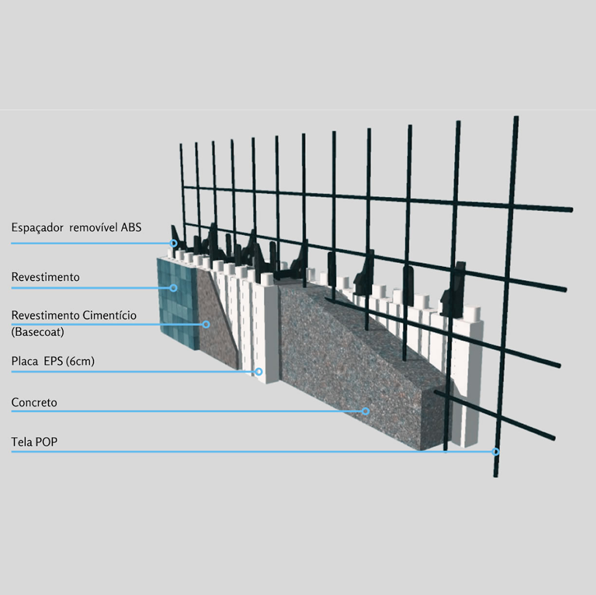 Consiste em blocos de justos encaixes, que operam com duas espessuras (17cm e 24cm), onde placas EPS tornam-se isolantes ambientais e impermeáveis, possuindo superfícies que facilitam a aderência de qualquer revestimento interno ou externo. O EPS, por ser impermeável, permite ser montado mesmo exposto as intempéries (e a obra não para).
